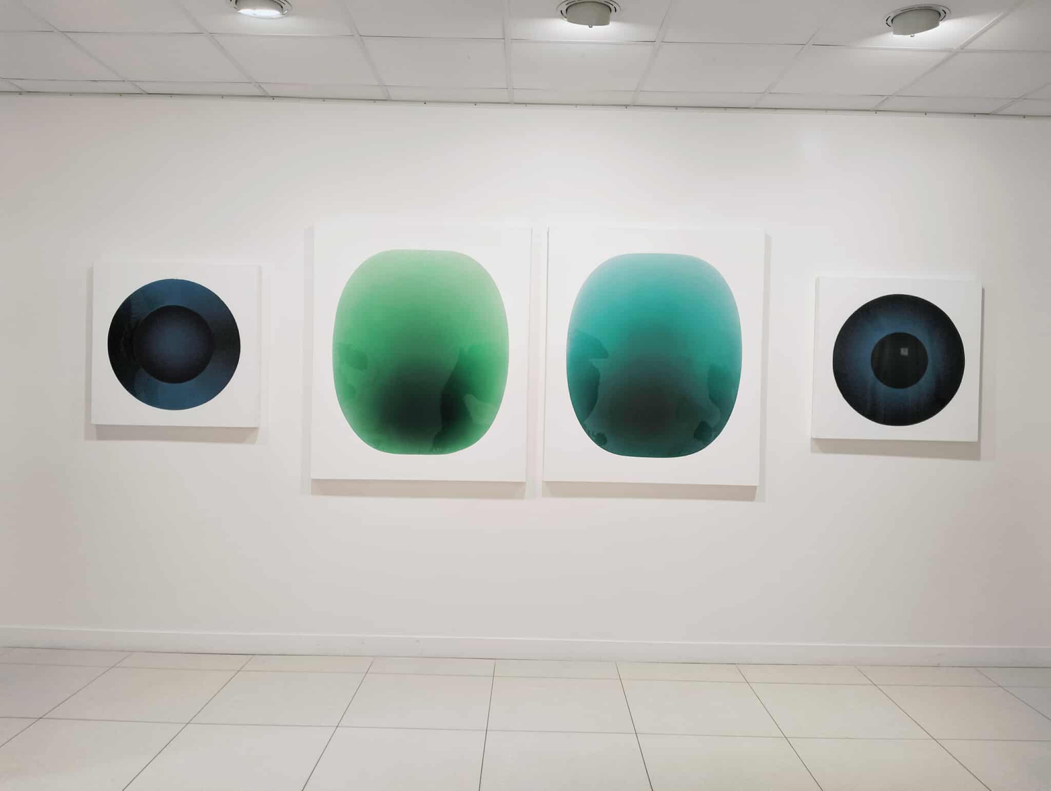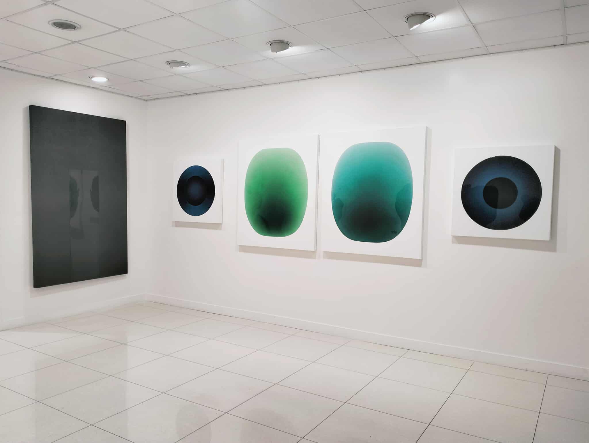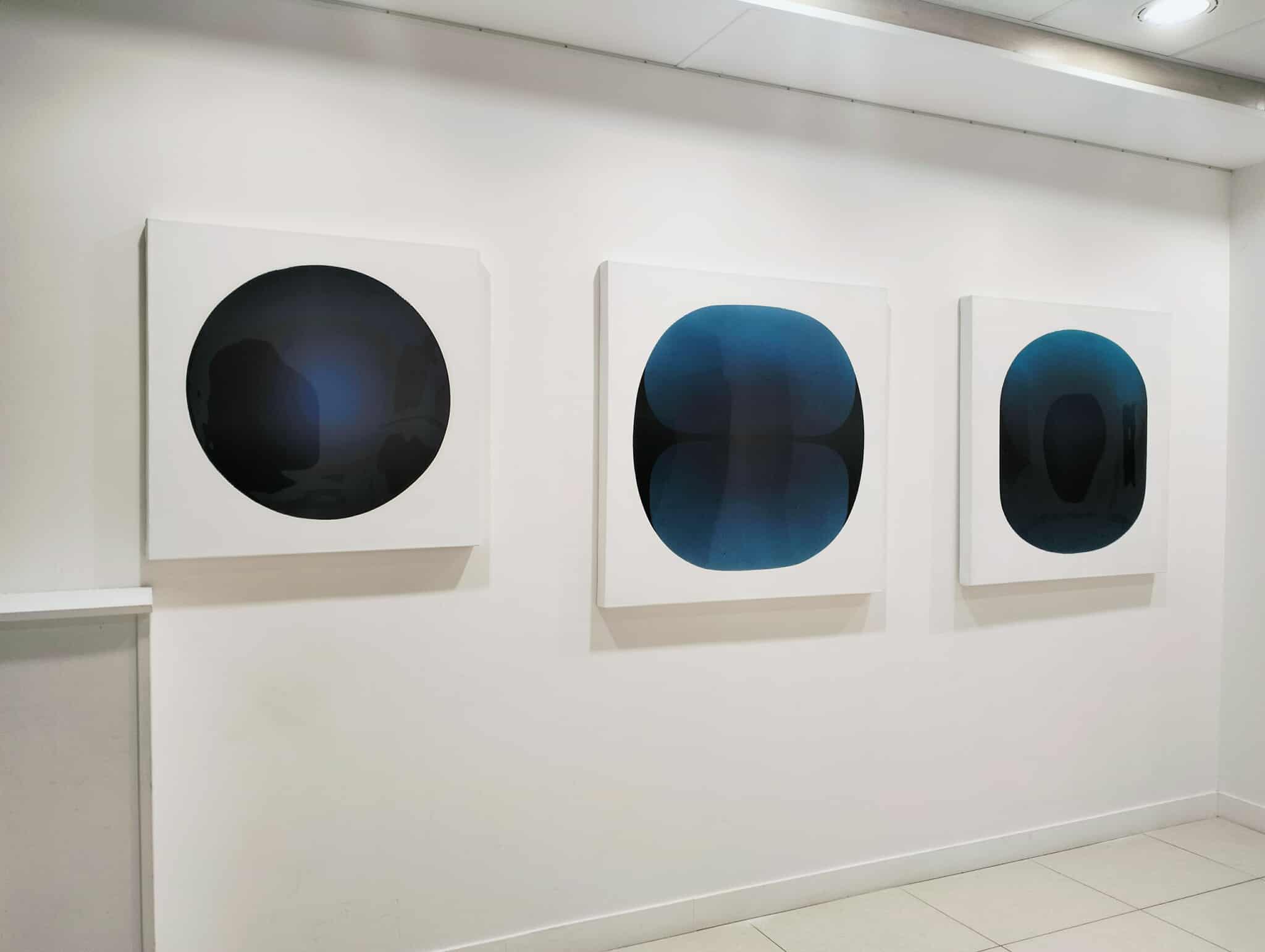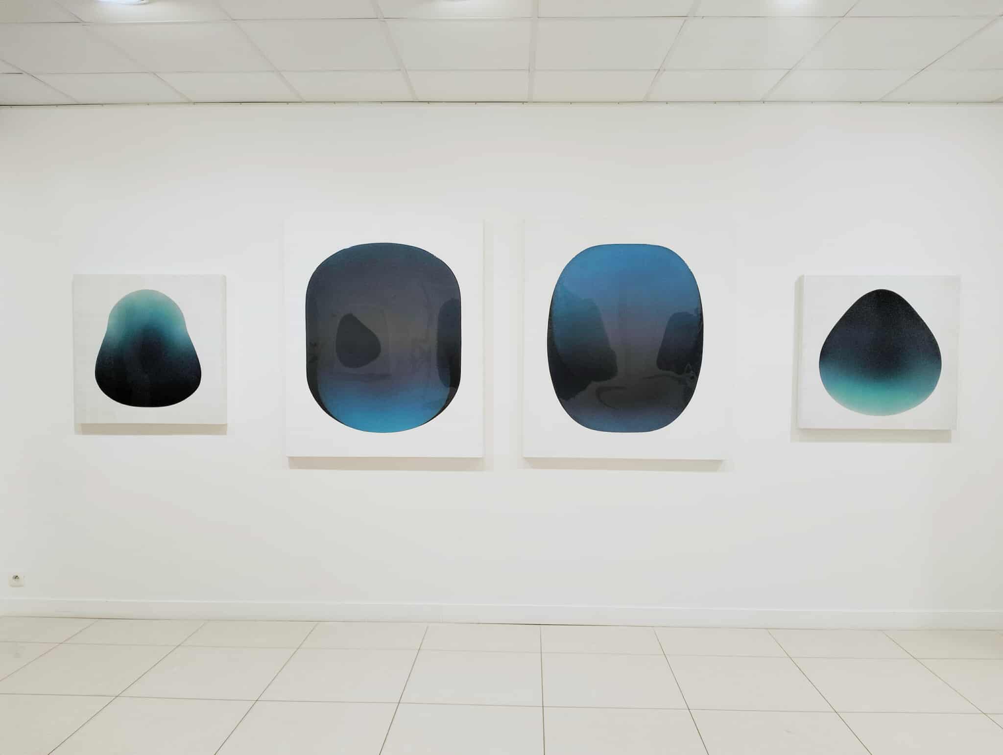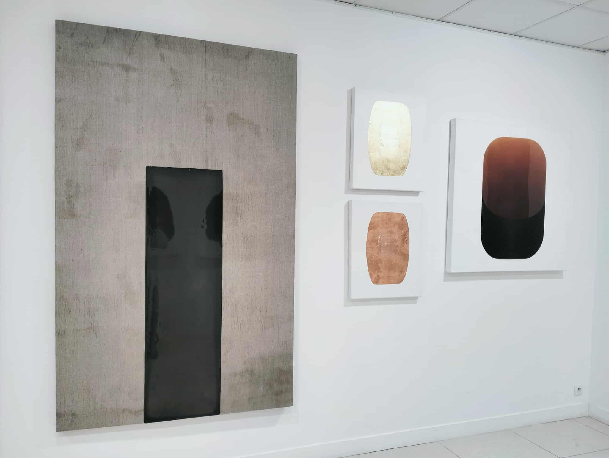 L’exposition actuelle se nomme « Monolithes » pour encourager le spectateur à emprunter une approche cosmique, en identifiant les écussons de Catherine Ludeau à ces apparitions de 2001 l‘Odyssée de l’espace. La contemplation de sa peinture, en effet, amène le regard à s’immerger, voire à se laisser aspirer vers les zones les plus foncées de la toile qui deviennent un espace de déplacement interne -vers les tréfonds sombres, le plus lointain, l’inconscient alors. Il est utile de rappeler que la fascination astronomique contient toujours en elle du symbolisme existentiel. Au plus loin des étoiles, « ceci, qui est le plus loin de toi, ceci qui est le plus informe », donc cette voix à l’intérieur qui nous reste étrangère mais qui nous constitue. Et nos reflets dans la résine se déforment, nos sens se brouillent, nous sommes pris par l’impression d’être vus à notre tour. Dans 2001, l‘Odyssée de l’espace, nous ne pouvons affirmer dans quelle mesure le monolithe est une entité vivante. Il se manifeste néanmoins pour transmettre. Nous ne savons rien de lui tout comme nous ne savons rien d’autre que des hypothèses des menhirs érigés par nos ancêtres. Ce que le monolithe porte reste dans les profondeurs, devient la profondeur en tant que telle avec les projections, l’imagination qu’elle engendre.