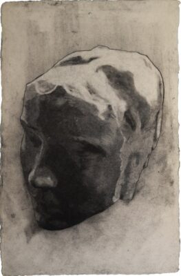 Quand j’ai découvert les dessins de Cassius Baron, avec ces visages aux yeux fermés, j’étais persuadé qu’ils représentaient justement ces sculptures religieuses en ruine, datant par exemple du Moyen-âge. Il s’agit en réalité de moulages en plâtre qu’il a fait du visage de ses proches, pour ensuite les dessiner au graphite, fusain et plomb. Leurs traits sont cependant altérés à coups de marteau et de gouge, comme si leur reproduction devait avoir une dimension archéologique et porter les traces d’une expérience projetée, imaginaire ou réellement vécue, les marques d’un temps ancestral et l’acceptation d’un oubli dont on soupçonne un symbolisme personnel, la recherche introspective de l’artiste lui-même. Les liens avec son entourage sont immobilisés en statues impénétrables, baignées dans un clair-obscur solennel au calme absolu. Nous sommes peut-être face à une consolation : les visages seraient des masques mortuaires pour mieux accepter leur future disparition. Et de leur sérénité un murmure semble résonner, communiquer d’un dessin à l’autre ; ce serait l’écho de cette prière qui en a bâti les traits cérémonieux.