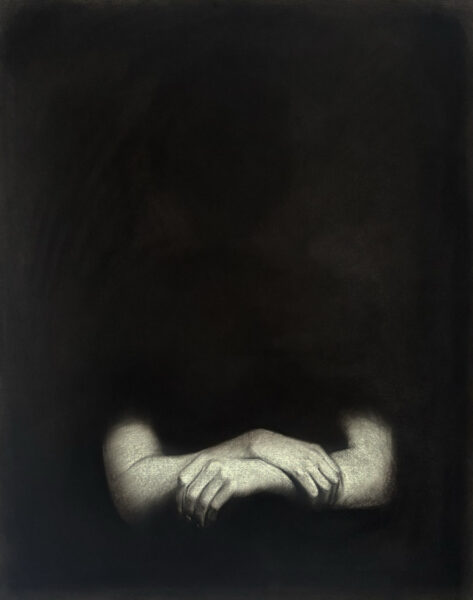 Cependant, j’avais besoin pour cette expo d’un retour à l’humain, parce qu’une prière s’adresse le plus souvent à quelqu’un. Elle pose la question d’un manque. Les dessins au fusain que j’ai sélectionnés de Samuel Martin représentent des corps dont on ne discerne pas le visage ou l’intention des gestes. On y devine un affrontement dans le hors-champ du dyptique « JK », où une femme, puis un homme, ont le corps empoigné, et un deuil dans l’obscurité de « Noches I », portrait où l’individu au-delà de ses bras est effacé. Les bras, en fait, sont le sujet de ces dessins : organes symbolisant notre capacité à agir, à accueillir mais aussi à exécuter. Nous pourrions voir la présentation de ces trois dessins sous l’angle contextuel de la prière, mais il n’y a pas que ça. Par ce qui leur manque, ils expriment aussi le désir qui les a fait naître. Pour « Noches I », cela peut-être le souvenir, la découverte, ou encore le remplacement d’une figure absente, et pour « JK », cela peut-être l’annihilation de l’autre, ou pourquoi pas, sa rencontre sexuelle : la réponse à cette question ne sera pas formulée. Car au final ce qui importe, dans la prière, c’est le désir en lui-même. C’est bien cela qui « nourrit le monde ».